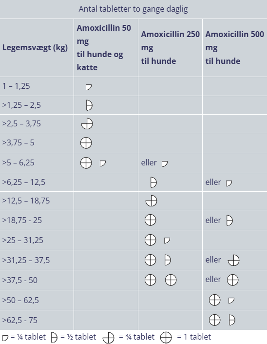 Den følgende tabel er beregnet som en guide til at levere præparatet med en standarddosis på 10 mg pr. kg. legemsvægt to gange daglig.